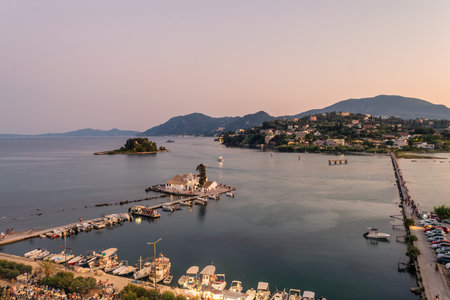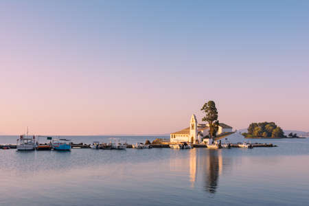 Evening scene of Vlacherna monastery and Pontikonisi island, Kanoni, Corfu, Greece