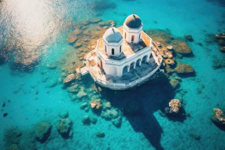 Orthodox Basilica Church on a Small Island in the Sea top aerial view. Generative AI