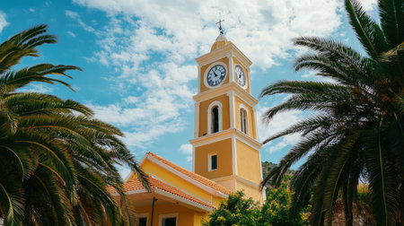 The historical clock tower in Old Dos, Mandoulakka Square of Alicos is an iconic landmark and the most famous place to visit for its beautiful architecture and scenic surroundings. It stands tall against the blue sky with white clouds, surrounded by lush green palm trees on both sides. The scene captures people walking around enjoying their time at Kodousi Square, also known as Ken's Vegetation Park. A hotel building can be seen nearby. --chaos 30 --ar 16:9 --v 6.1 Job ID: d93ad390-2cc7-41b1-87ca-c123bf22dc5c