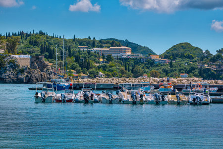 Corfu Island / Greece- May 3, 2019: view of beautiful Paleokastritsa Harbor with turquoise water, boats for rent on water surface, green trees and mountains on the horizon. Spring landscape with blue sky.