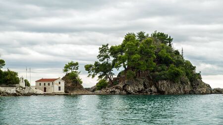 Greece Parga. Panagia island off the coast of Parga, small chapel and trees on the rock, cloudy sky background.