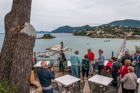 View of iconic landmark Vlacherna Monastery in Corfu (Kerkyra) island. Tourists and landscape are also in the scene.