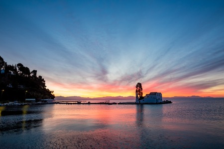 Sunset scene of Vlacherna monastery, Kanoni, Corfu, Greece
