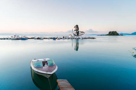 Vlacherna monastery and a boat at sunrise, Kanoni, Corfu island Greece