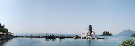 Panoramic view of Vlacherna Monastery and Mouse island on Corfu, Greece