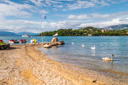 White swans swimming on clear lake against town buildings surrounded by dense green forests and high hills of Corfu island in Greece