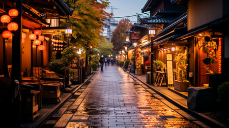 An alley of autumn maple trees in Japan adorned with paper lantern garlands, people walking away from camera in the background. AI generative.