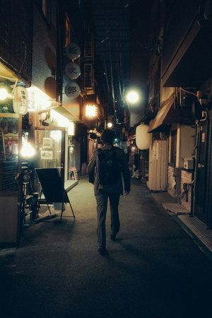 Unidentified man walking on the street at night. Tokyo is the capital and most populous city of Japan.