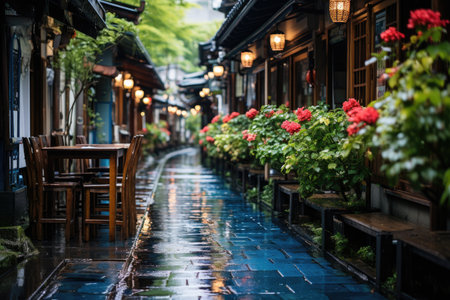 A peaceful alleyway lined with traditional Japanese shops. Lush greenery and paper lanterns add to the serene atmosphere