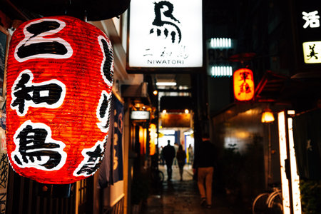 TOKYO, JAPAN - APR 21, 2019 : Japan Bar street Izakaya Red light sign with people drinking. Tokyo Nightlife