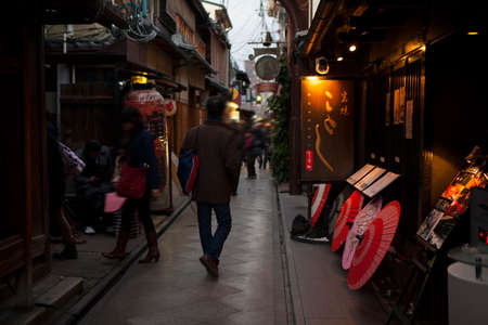 Kyoto, Japan - April 4, 2016 : Pontocho, Japanese restaurant and pub alley at evening