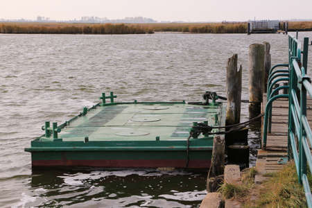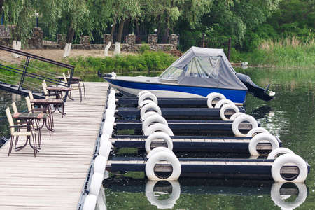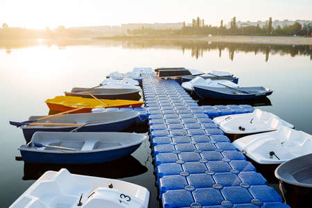 Boat station boats moored to the pier on the river, rental of swimming facilities, floating pier, pontoon on the lake, city recreation park. high quality photo