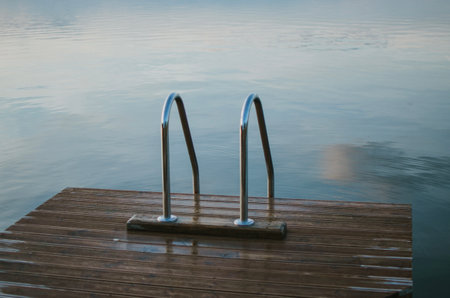 A wooden bridge with an iron staircase leading to the clear water of the lake. It's a summer day, the water is clean and calm, creating an atmosphere of privacy and relaxation in nature