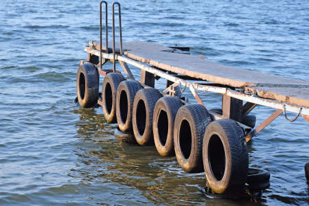 Wooden pier on the river close-up. On the side of the pier are old automobile tires. Old boat mooring on the river.