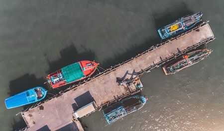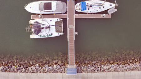 Top view from sky of boat marina with outdoor sun lighting.