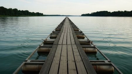 Symmetric horizontal photography of wooden pier on a lake or river. Trees and forest in the background. A place of tranquility, relaxation alone with nature