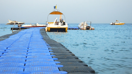Sharm-El-Sheikh, Egypt - August 27, 2017: Powerboats and touristic ship are moored at the floating jetty dock at the tropical resort beach at sunset. Seaside area for vacation and summer relaxation.