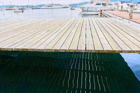 A pier in the form of wooden boards against the background of moored ships. Montenegro Tivat.