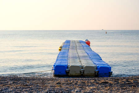 plastic pontoon on the beach for easy entry into the water in the early morning calm sea. pebble beach in Turkey