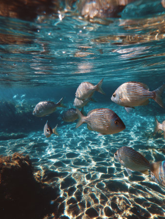 Colorful fish navigate through sparkling clear water, creating a tranquil underwater atmosphere enriched by shimmering light reflections.