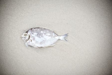 Dead caribbean fish stranded on beach sand with sargassum in Playa del Carmen Quintana Roo Mexico.