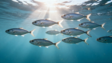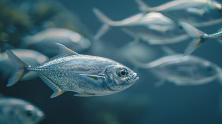 A captivating scene of a school of fish swimming in clear ocean waters, illuminated by soft natural light, creating a serene underwater atmosphere.
