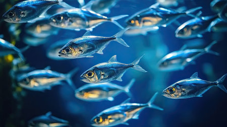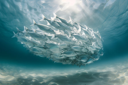 An underwater dance of light and shadows as a sweeping school of silver fish glide through the tranquil blue ocean. Generative AI