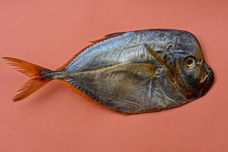 Tasty smoked vomer selene sea fish on wooden background. Smoked fish is a wonderful gourmet meal.