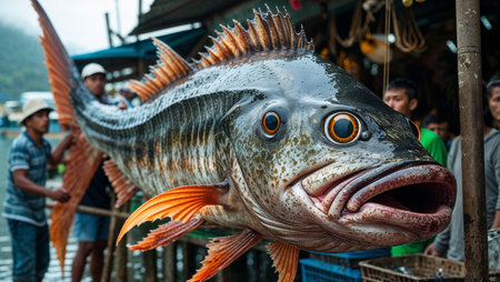 A massive, otherworldly fish with glowing eyes lies on display at a busy market, surrounded by shocked and amazed onlookers. The creature's sharp fins and unusual size evoke a surreal, apocalyptic atmosphere, resembling a doomsday or mutant fish.