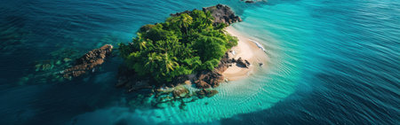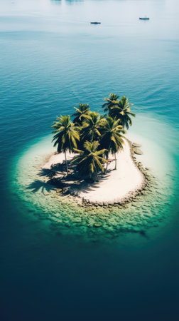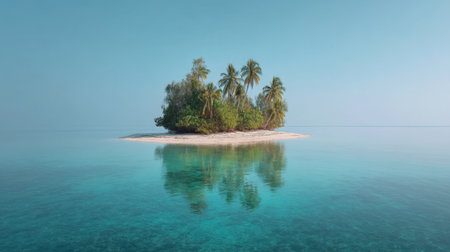 Discover a tranquil tropical island oasis, featuring vibrant palm trees and crystal-clear water surrounded by serenity, ideal for vacation and relaxation themes.