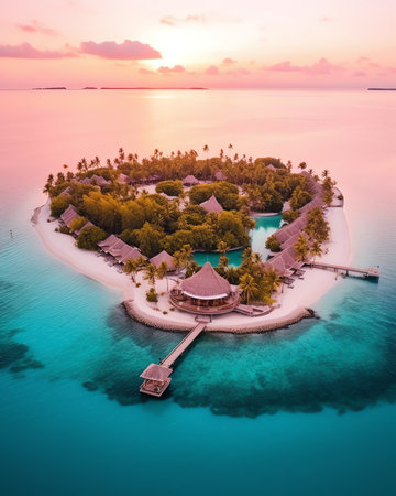 Generative AI : Aerial view of bungalows along the reef at sunset on Baa Atoll Kanifushi Island Maldives