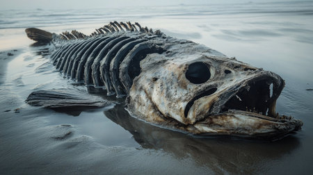 An extraordinary image capturing a large fish skeleton washed ashore at dusk, showcasing intricate bone structures against a serene ocean backdrop.