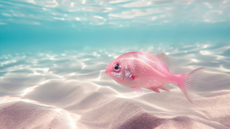 Pink fish swimming above sandy seabed under clear water.