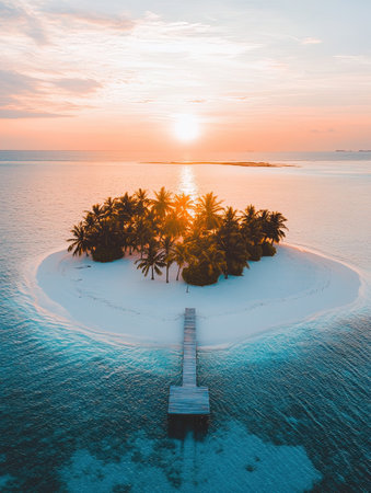 Aerial view of a wooden pier leading to a small tropical island with palm trees at sunset