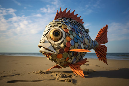 A stranded fish on a sandy beach highlights environmental concerns. The blurred cityscape and mountains in the background emphasize the impact of pollution on nature.