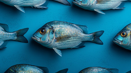 Top view of fish on a bright blue surface for wallpapers and backgrounds til