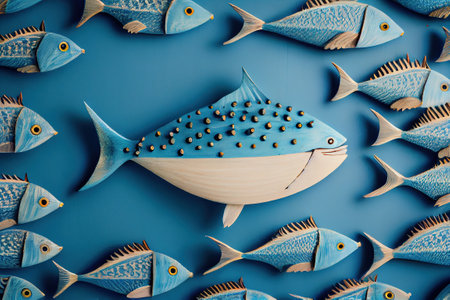 Toys wooden carved fish on a blue insulated background. Generative AI
