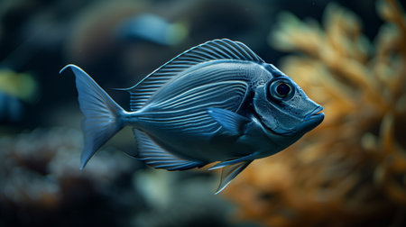 Close-up of a blue tropical fish swimming in an aquarium.