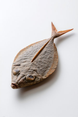 Flatfish resting on smooth white background highlighting unique shape and details. Clean presentation suitable for culinary, seafood market, restaurant concepts.