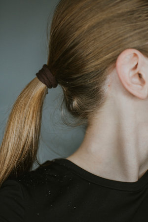 Dandruff from psoriasis from scalp on shoulder of woman close up. High quality photo