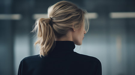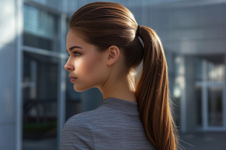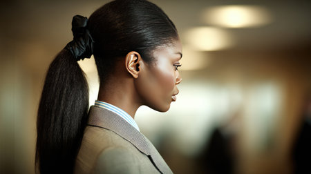 A profile view of an elegant woman in business attire showcases her sleek ponytail and sophisticated look, capturing the essence of professionalism and confidence in a modern office setting.