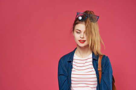 cheerful woman fashionable youth clothes pink background backpack