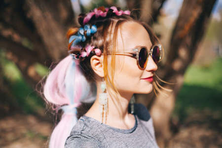 A young girl with her hair in pigtails. The pigtails are colorful and have a lot of beads