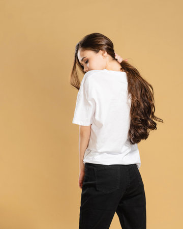 Young slender girl in a white t-shirt with her back turned on a pastel orange studio background.