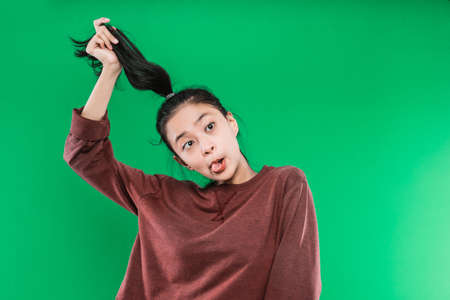 Portrait of crazy funny expression adult woman and the tongue comes out of the mouth while holding her long black hair up isolated on green background