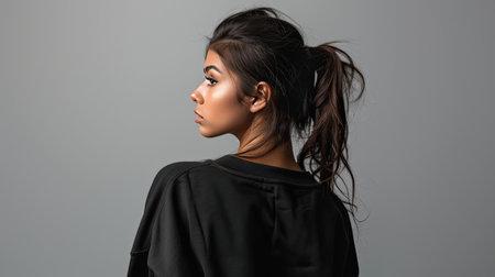 A graceful woman with long, black hair styled in a ponytail is captured in profile against a softly blurred background. The image highlights elegance and fashion.