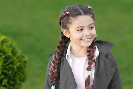 happy childrens day. Parks and outdoor. Spring fashion for little girl. Happy child with thuja. childrens day concept. Autumn weather. Cypress tree. happy little girl with trendy hairstyle. happiness