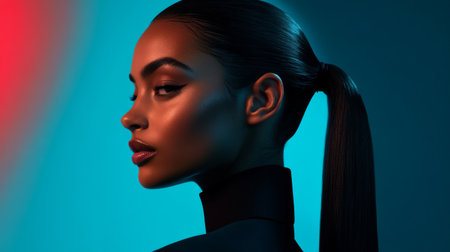 A stylish shot of a woman with a sleek, high ponytail, featuring smooth, glossy hair and a polished look, set against a minimalistic background