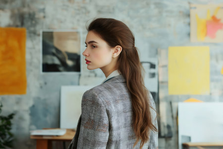 Young woman art curator with long brown hair wearing blazer observing paintings in art gallery