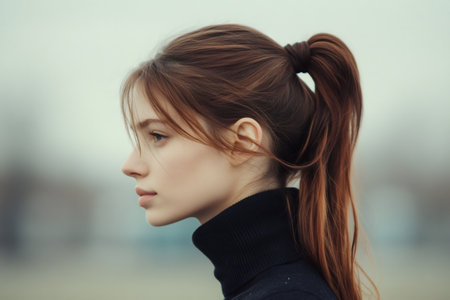 Young woman with a classic ponytail and minimal styling, wearing a black turtleneck, looking ahead with a pensive expression